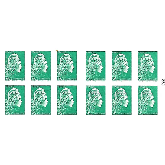 Il contient 12 timbres-poste autoadhésifs TVP vert, c’est‑à‑dire des timbres à validité permanente permettant d’affranchir une Lettre Verte jusqu’à 20 g, quel que soit le tarif postal en vigueur.